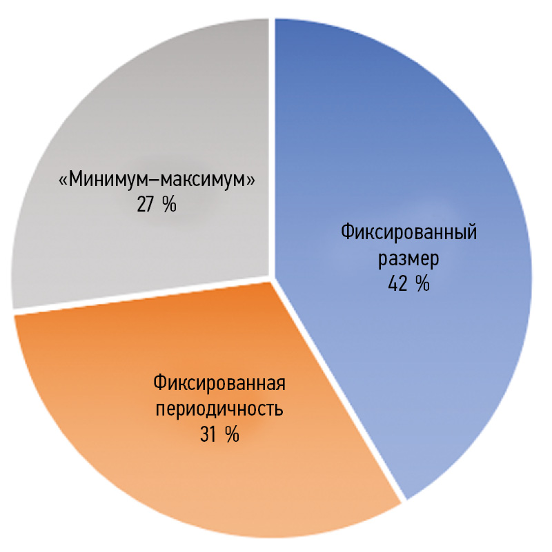 Результаты. В результате чего получим следующие значения: модель с фиксированным размером заказа — 41,5 %, модель с фиксированной периодичностью заказа — 31,4 %, модель «минимум–максимум» — 27,1 %.