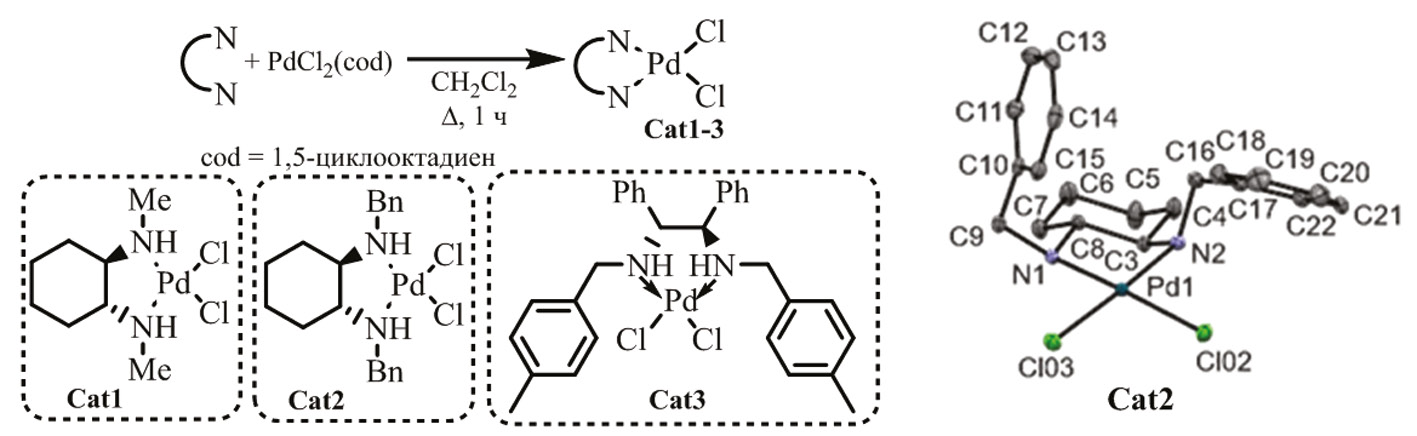 Также были синтезированы несколько комплексов палладия с хиральными вицинальными диаминами Cat1-3, по реакции замещения 1,5-циклооктадиена соответствующими лигандами. Для комплекса с (R,R)-N,N-дибензилциклогексан-1,2-диамином Cat2 получены данные РСА (рис. 2).