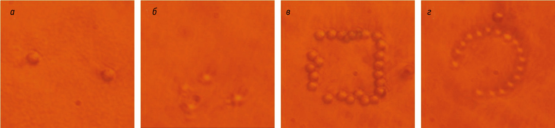 Рис. 2. Пример фиксации латексных микросфер с клетками kidney (а, б) и thyroid (в, г) в заданных конфигурациях